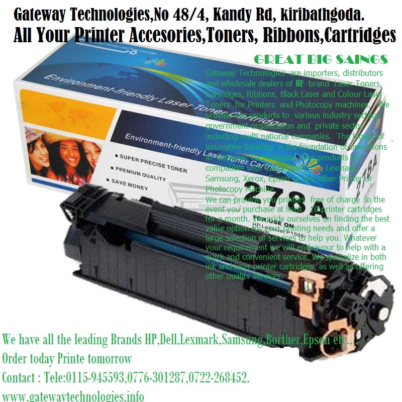 Gateway Technologies are importers, distributors and wholesale dealers of HF brand Laser Toners, Cartridges, Ribbons, Black Laser and Colour Laser Toners for Printers and Photocopy machines. We provide our products to various industry sectors, government organization and private sector including multi national companies. The legacy of innovative thinking is the foundation of operations in Gateway Technologies. Our products are compatible with Canon, Dell, HP, Lexmark, Samsung, Xerox, Epson or any other Printer or Photocopy Machine.