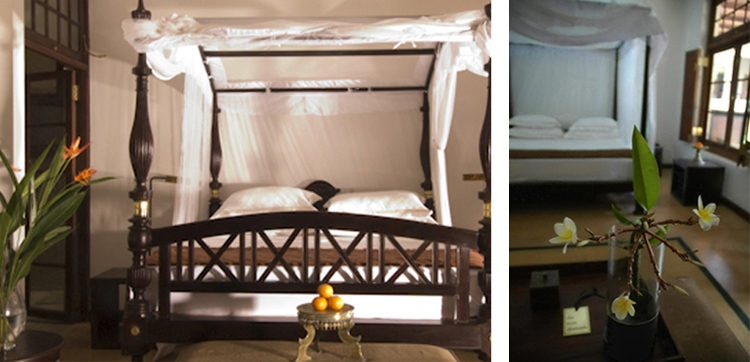 Three very generous rooms, each air-conditioned with a modern king size four-poster bed, luxurious white cotton sheets and a canopied mosquito net. The gallery bathroom has a shower, Grohe taps and Italian fittings. Beyond double French doors is a tiny, private parterre garden and wall fountain, and the poolside verandah provides a comfortable daybed to overlook the hotel courtyard and garden. Perfect for a lazy afternoon reading or for taking tea with freshly baked coconut and lime tart, or perhaps writing your postcards back home. The garden rooms are comfortable for two people and book early.